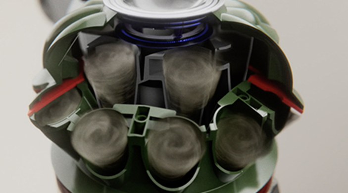 A két szinten elhelyezkedő, 15 radiális ciklon akár 110 000 fordulat/perc fordulatszámú centrifugális erőt generál, hogy erőteljes szívóerővel felfogja a mikroszkopikus port.